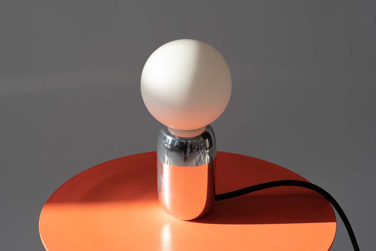 Bubble Lamp is a sculptural table lamp with a polished metal base that captures and distorts its environment and a matte glass light source with full dim-to-warm adjustment capable of illuminating a space or dimming to candle light.